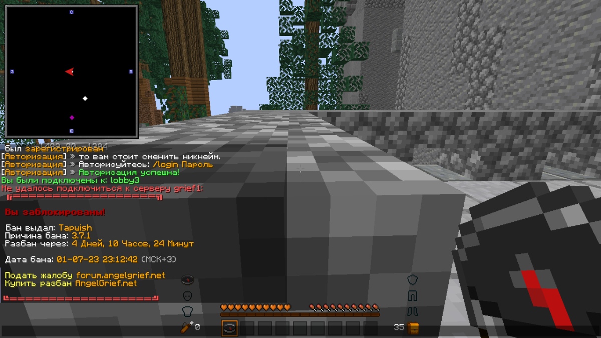 01_Ded_Shot_2 Posted July 2, 2023 Author Share Posted July 2, 2023 (edited) 2 часа назад, 01_Ded_Shot_2 сказал: 1. Ваш [ник]. 01_Ded_Shot_2 2. [Ник] нарушителя. Tapwish 3. Описание ситуации. догоняли чувака, который ливал по кд и оффали флай перед ударом по нему.Это было в воде и забанили без река 4. Сервер на котором произошла ситуация. 1 grief 5. Доказательства (Скриншот/Видео). Edited July 2, 2023 by 01_Ded_Shot_2 Link to comment Share on other sites More sharing options...