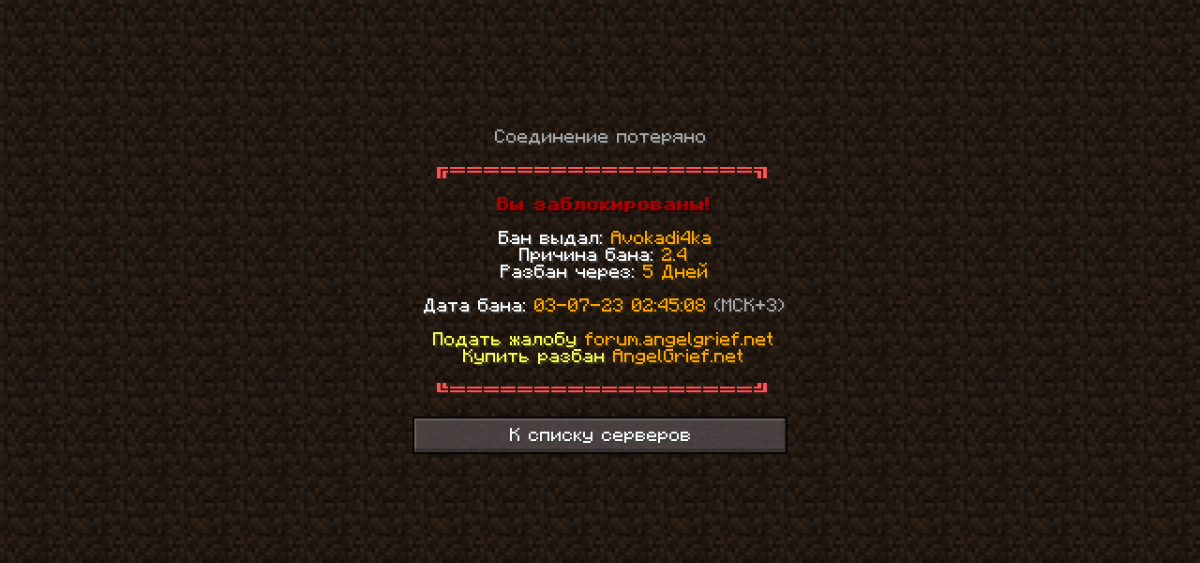 kotonarU Posted July 2, 2023 Share Posted July 2, 2023 1. Ваш [ник]. kotonarU_KP 2. [Ник] нарушителя. Avokadi4ka 3. Описание ситуации. бан без докв оск род 4. Сервер на котором произошла ситуация. 1 anarhy 5. Доказательства (Скриншот/Видео). Link to comment Share on other sites More sharing options...