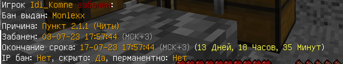 Idi_Komne Posted July 3, 2023 Share Posted July 3, 2023 1. Ваш [ник]. Idi_Komne 2. [Ник] нарушителя. Moonkills 3. Описание ситуации. Мы заказывали на варg пришло два друга один из них был нарушитель после чего мы начали с ними пвп двое друзей были с читами я смог их убить и После чего он ванеше полетел залутал все свои ресурсы и украл тотемы с инвт моего друга и после вызвал меня на проверку и забанил !!! забанил он меня не потому пункту 4. Сервер на котором произошла ситуация. grif1 5. Доказательства (Скриншот/Видео). 6. от меня прошу запросить у него рек с момента пвп и после бана Link to comment Share on other sites More sharing options...