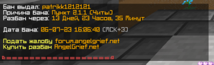 LUCHIKTOPCHIK Posted July 6, 2023 Share Posted July 6, 2023 Ваша жалоба отклонена, жалоба не актуальна. Отклонена Причина отказа: повторная жалоба Тема будет закрыта после данного сообщения Приятной игры на сервере AngelMine vk - @nezloyluchik ds - LUCHIKST#6099 Luchik penit Link to comment Share on other sites More sharing options...